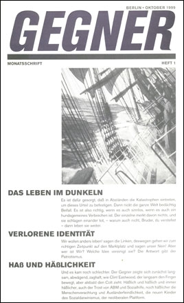 Menschen ringsum! GEGNER akzentuiert Unmut und attestiert Ausblick ohne jegliche Segnung des Trostes, der nicht bei uns sein kann. Während der Übergangsphase von der Spezialdemokratie zum Menschenpark muß spartanische Reife als Artikulation des antikapitalitischen Grundzorns zum guten Ton gehören. Dem kapitalistischen Siegeszug über (Ost-)Europa in den 90ern, den Bonzen, vormalige kalte und jetzige heiße Krieger, Politiker, »Historiker« und andere Büttel als unentrinnbare »Zivilisierung« hinstellen, erklären wir unsere Gegnerschaft. Der kapitalistische Marktsieg hat ein Nachspiel – Gleichheit! Darum: »gezielte Haufenwirtschaft«.